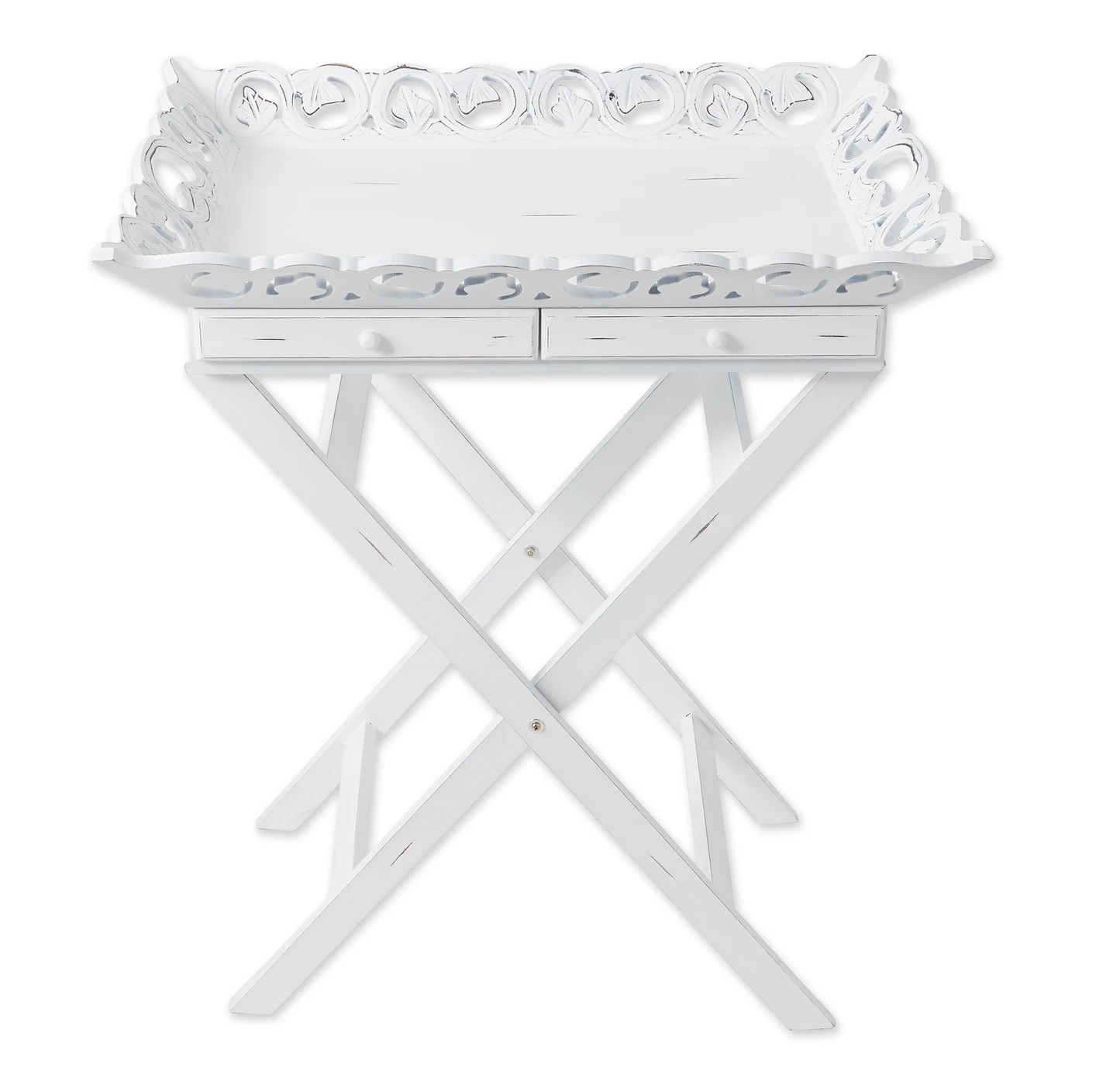 • Gracious entertaining is a snap with this stylish tray table! Elegantly aged white finish with a carved rim and two handy drawers; folding legs for easy storage.